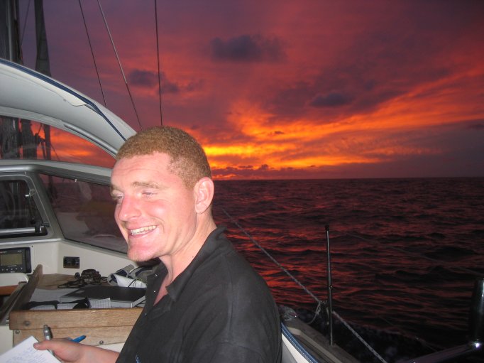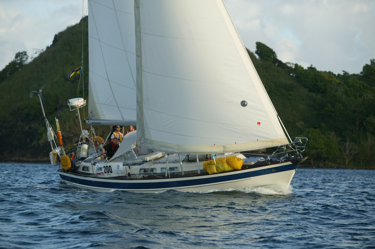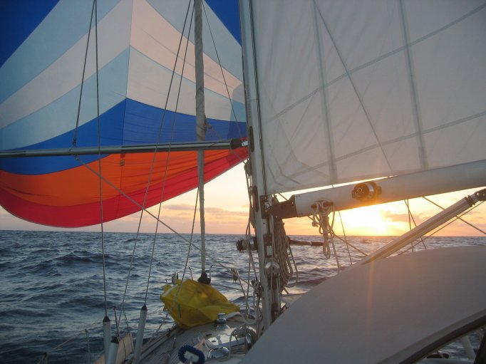 | Vi seglade mycket spinnacker under överfärden. Ca 60-70% av tiden. | Henrik gör miner i solnedgången. | Efter 19 dygn & 20 h rundar vi Pigeon Island på St Lucias nordväst spets. | Nefertiti stävar mot mål i ARC 2004. |